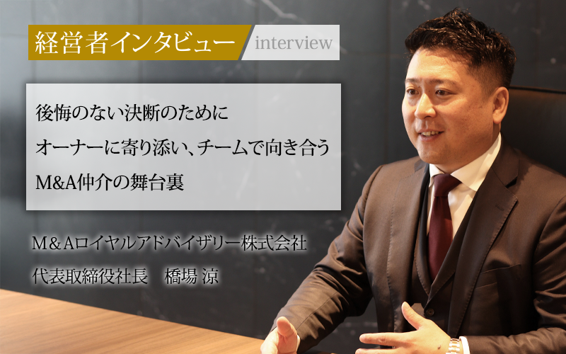 M&Aロイヤルアドバイザリー株式会社は、中小企業のM&A仲介や事業承継支援を専門とする会社だ。売買契約の成立だけにとどまらず、経営者の想いに寄り添ったM&Aの実現を強みとする事業の背景には、どのような取り組みがあるのだろうか。同社の創業者であり、代表取締役社長の橋場涼氏に話をうかがった。