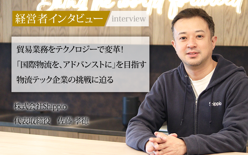 メールでのやり取りや電話確認が当たり前だった国際物流の世界に、テクノロジーの力で変革を起こす株式会社Shippio。同社は2016年の創業以来、貿易業務のデジタルサービス展開を推進し、2022年には協和海運株式会社をM&A、通関事業にも進出している。貿易DXを通じて日本のサプライチェーン強化に挑む同社代表取締役の佐藤孝徳氏に話を聞いた。