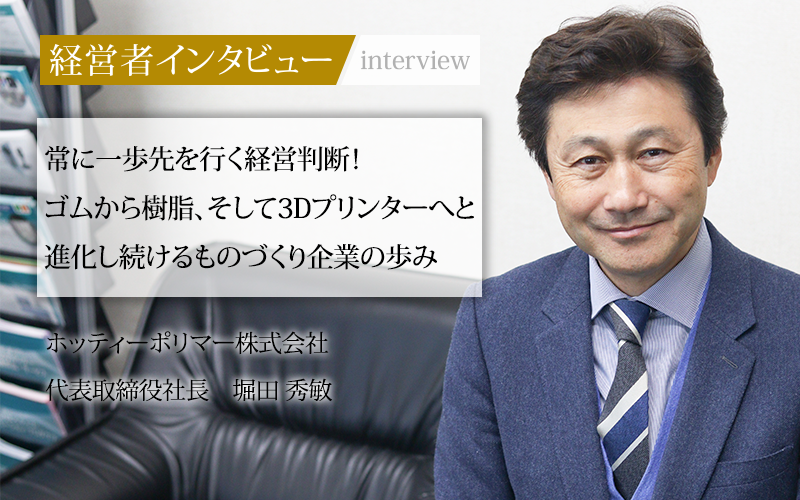 自動車窓枠のゴム部品から始まり、時代の変化を先読みして樹脂事業へ転換、さらに3Dプリンター事業に進出し、特殊フィラメントで業界をリードするホッティーポリマー株式会社。タイ工場の設立や3Dプリンター事業の開拓など、常に次の一手を打ち続ける同社の挑戦について、代表取締役社長の堀田秀敏氏に話を聞いた。
