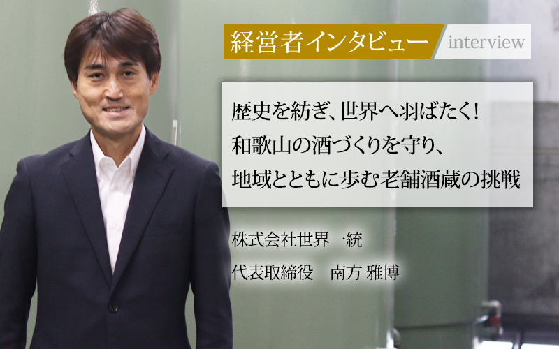 南方雅博/1975年、和歌山県生まれ。慶應義塾大学卒業。ものづくりの世界に興味をひかれ、建築物を作品と呼ぶ株式会社竹中工務店に入社。人事・工事現場・営業に8年間従事。2007年、家業である株式会社世界一統に入社。自社ブランドとして、日本酒は自らの名前でもある「南方」、リキュールは和歌山県産果実使用「和歌のめぐみ」を立ち上げる。現在は17か国に輸出し、大きな柱に成長。地元では全酒類卸売業も展開している。