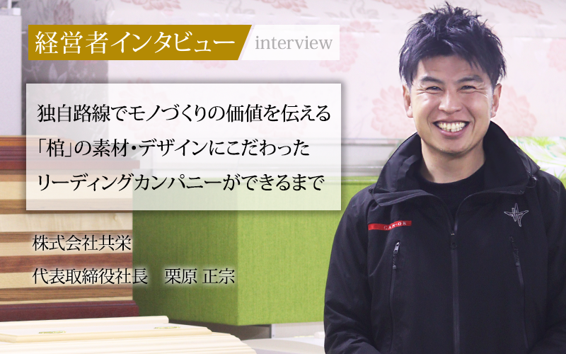 入社後からさまざまなアイデアを出してきた三代目代表取締役社長の栗原正宗氏。社長就任後も新しいお棺の製造や関連製品の販売、人材育成などに積極的に取り組み、積極的に事業拡大につながる改革を続けている。同社はこれからも価格競争に巻き込まれることなく、多彩な製品を世の中に送り出すことで成長を続けていくことだろう。
