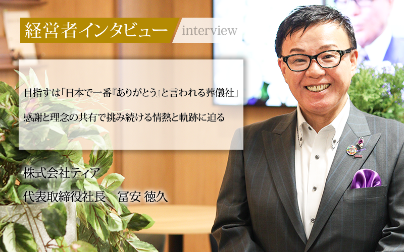 冨安徳久/株式会社ティア代表取締役社長。葬儀社での現場経験を経て、1997年に株式会社ティアを創業。創業当初から「日本で一番『ありがとう』と言われる葬儀社」を理念に掲げ、価格の透明化や人材教育に尽力。現在は全国展開を視野に、生活関連事業や感謝想などの新規事業にも積極的に挑戦している。