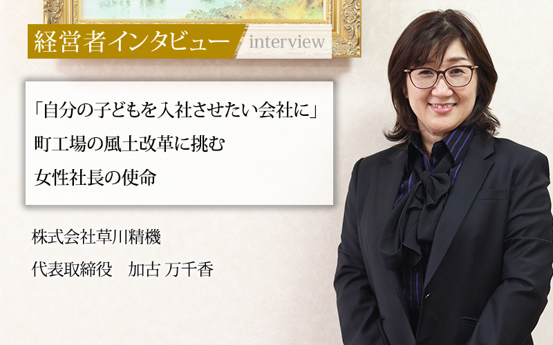 加古万千香/1969年京都府生まれ。1992年龍谷大学卒業。1999年歯科医療機器メーカーの勤務を経てキャリア採用にて株式会社草川精機に入社。主に経理、人事業務担当。2008年総務・経理課課長・業務課課長(兼任)に昇格。2018年専務取締役就任。2023年代表取締役社長就任。