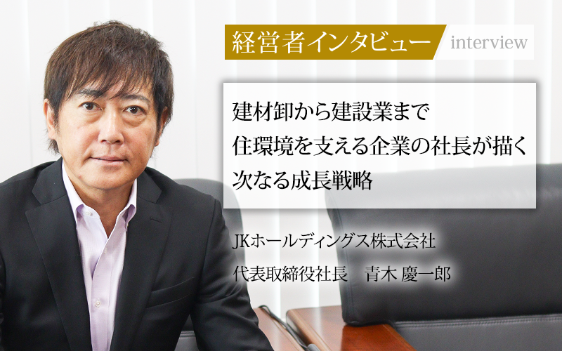 住宅建材の専門商社として、卸・小売・製造をグループ内で一貫展開するJKホールディングス株式会社。グループ40社以上を束ねる同社のかじ取りを担うのが、代表取締役社長の青木慶一郎氏だ。