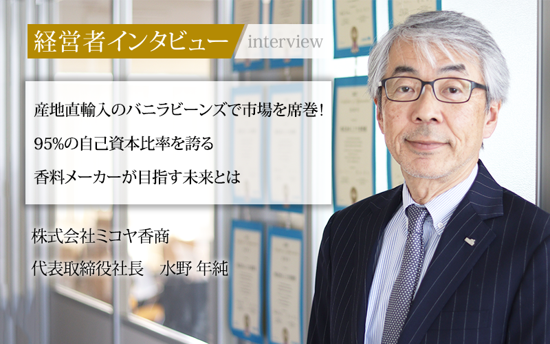 香りのプロフェッショナルとして、帝国ホテルやホテルニューオータニなどの一流ホテルにも香料を提供している株式会社ミコヤ香商。同社は、バニラビーンズの輸入から加工、販売までを一貫して手がける体制で、常に高品質な香料を供給している。全国4,000社との直接取引を武器に成長を続ける同社の代表取締役社長、水野年純氏に話を聞いた。