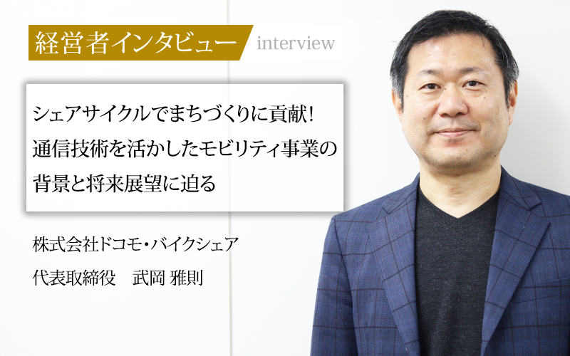 株式会社ドコモ・バイクシェアは、NTTドコモのシェアモビリティ(※)事業会社だ。環境に優しい移動手段によって、日本のまちづくりに貢献するという理念を掲げ、電動アシスト付き自転車とモバイル技術を融合させたサービスを展開している。通信事業会社であるNTTドコモが、なぜシェアモビリティ事業に参入したのか。株式会社ドコモ・バイクシェアの代表取締役を務める武岡雅則氏に、事業の背景や今後の展望についてうかがった。
