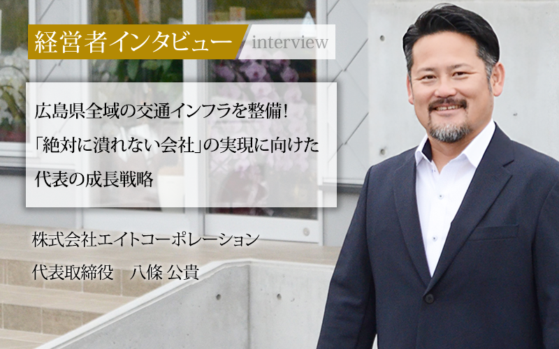 広島県内において、交通インフラ整備の豊富な実績を持つ、株式会社エイトコーポレーション。ほかにも、一般土木や外装塗装、橋梁補修など幅広い事業を運営している会社だ。公共性が高い事業を手がけ、安定感のある会社として知られる同社だが、代表取締役の八條公貴氏は「一時は会社が危機的状況にあった」と語る。一体どのような苦労を乗り越えて、現在の同社があるのか。今回は、八條氏に、起業時のエピソードや事業の強み、同氏ならではの成長戦略などを聞いた。