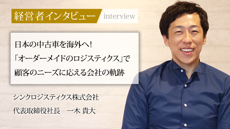 一木貴大/久留米工業高等専門学校卒業後、ジャストガレージ株式会社に入社し、中古車の輸出事業に関わる。2013年シンクロジスティクス株式会社を創業し、代表取締役社長に就任。輸出代行事業に留まらない、物流業務全体の課題に対するソリューションの提案に尽力している。