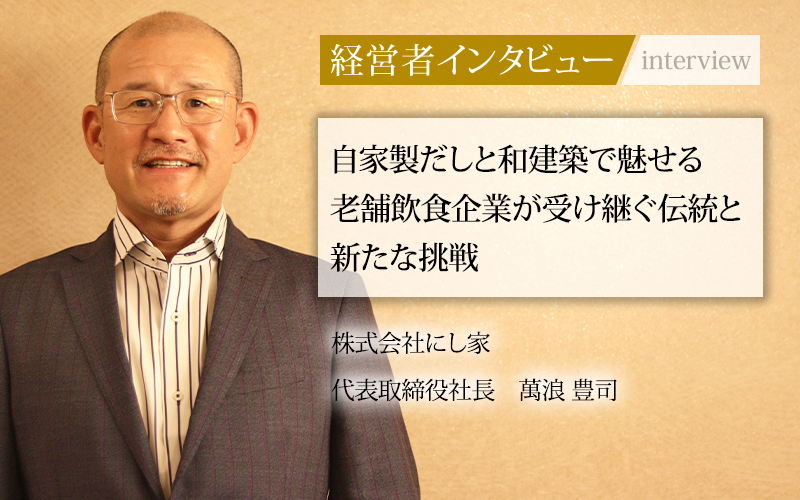 萬浪豊司/1982年、近畿大学商経学部(現・経営学部)経営学科卒業。大学卒業後、2年間アパレル業界で働き、25歳のときに飲食業界に転職する。現場で約20年間働いたのち、2008年に株式会社にし家の代表取締役社長に就任、現在に至る。