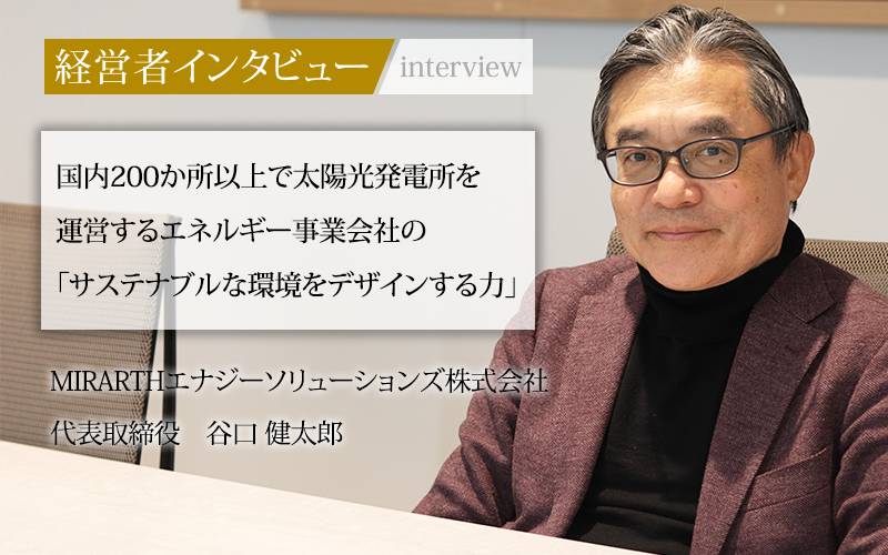 谷口健太郎/1961年広島県生まれ、早稲田大学理工学部卒業、同大学院修了。MIRARTHホールディングス傘下のMIRARTHエナジーソリューションズ株式会社代表取締役。日商岩井(現・双日)やソフトバンク勤務を経て、シーエムネット副社長、ディーコープ社長、会長を歴任。株式会社タカラレーベン社外取締役兼任。2022年にディーコープ会長を退任後、MIRARTHエナジーソリューションズ株式会社代表取締役に就任。2023年からは株式会社ルネサンス社外取締役も務める。