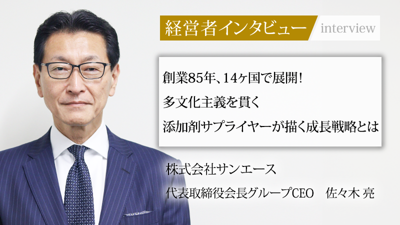 創業85年、世界14ヶ国に22拠点を展開し、圧倒的な生産力でプラスチック添加剤を始めとする特殊添加剤をグローバルに供給するリーディングサプライヤー、株式会社サンエース。現在、海外での販売が売上の9割を占めるという同社が拠点を拡大してきたプロセス、製品の強み、SDGs観点での新製品開発などについて、同社の代表取締役会長グループCEOである佐々木亮氏に話をうかがった。