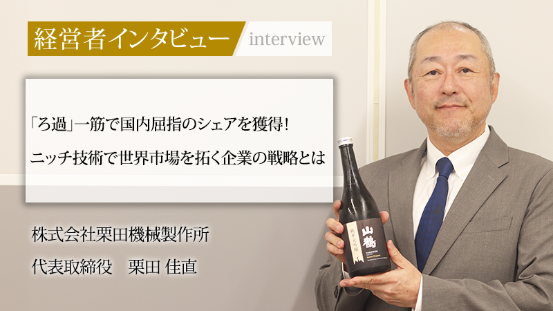 株式会社栗田機械製作所は、工業用フィルタープレスを主力とし、高度な「固液分離」技術で多様な産業を支えている企業。同社は、対象物の特性を見極め、最適な解決策を提供する技術力で、国内外から厚い信頼を寄せられている。若くして父の後を継ぎ、幾多の困難を社員と共に乗り越えてきた代表取締役の栗田佳直氏に、その歩みと事業への思い、そして未来への展望をうかがった。