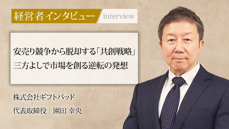 株式会社ギフトパッドは、従来の紙のカタログギフトをWeb化するオンラインギフトサービスから出発し、企業や自治体のニーズに応える多様なソリューションへと事業を拡大してきた。同社は、関わる全ての人々が幸せになる「三方よし」の精神をビジネスモデルの根幹に据え、顧客起点の柔軟なサービス開発力を強みとする。ギタリストから英会話講師、医療コンサルタントという異色の経歴を持つ代表取締役の園田幸央氏に、その独自の経営哲学と日本経済の未来を見据えた展望について話を聞いた。