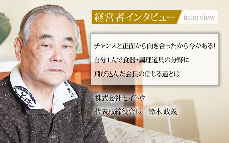 鈴木政義/1948年生まれ。静岡県磐田市出身。静岡県立袋井商業高等学校を卒業後、名古屋の商社に入社し修行を積む。その後、1973年に食器販売の会社を創業し、1981年に株式会社セイトウを設立する。