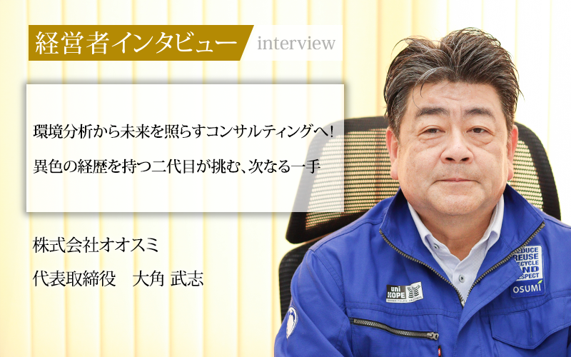 環境問題への意識が高まる現代。幅広い対応力と顧客密着の姿勢で課題解決に挑む株式会社オオスミ。分析・調査からコンサルティング、海外展開までの舵取りを担うのは、異色の経歴を持つ二代目代表、大角武志氏。その挑戦の軌跡を追った。