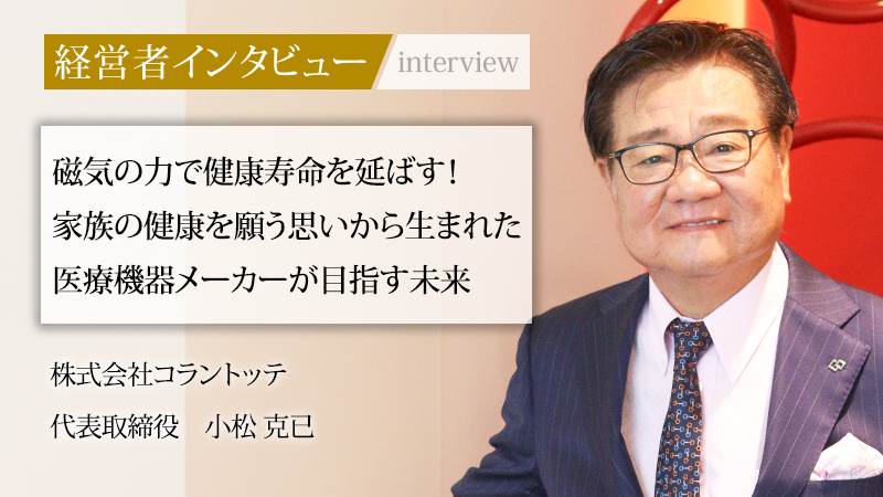 磁気の力を活用し、人々の健康をサポートしている株式会社コラントッテ。同社は独自の磁気配列技術を用いたネックレスを主力に、睡眠関連商品など健康寿命を延ばすための製品を幅広く展開している。建築業からスタートし、数々の事業を展開してきた経歴をもつ同社代表取締役の小松克已氏に、起業の原点から今後の展望まで話をうかがった。
