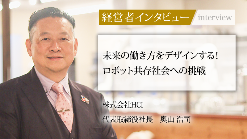 奥山浩司/1970年大阪府大東市生まれ。1994年福井大学工学部材料化学科卒業。同年某機械メーカーに入社。2002年に退職。同年、有限会社克己クリエイトを創立し、代表取締役に就任。2006年、有限会社克己クリエイトを株式会社HCIへ組織変更、代表取締役社長に就任。2021年、一般社団法人日本ロボット工業会理事、一般社団法人日本ロボットシステムインテグレータ協会副会長に就任。