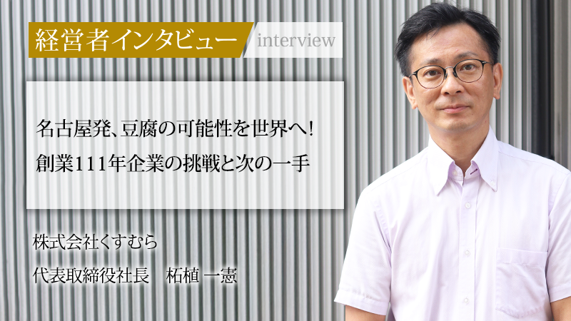 愛知県名古屋市で111年の歴史を刻む株式会社くすむら。木曽川の伏流水と国産大豆にこだわり、伝統の味を守りながら「寄せ豆腐」といった革新的な商品を展開してきた。近年は弁当や飲食事業も手がけ、豆腐の新たな可能性を追求する。厳しい豆腐業界で独自の戦略を貫き、成長を続ける同社の5代目、柘植一憲社長に話を聞いた。