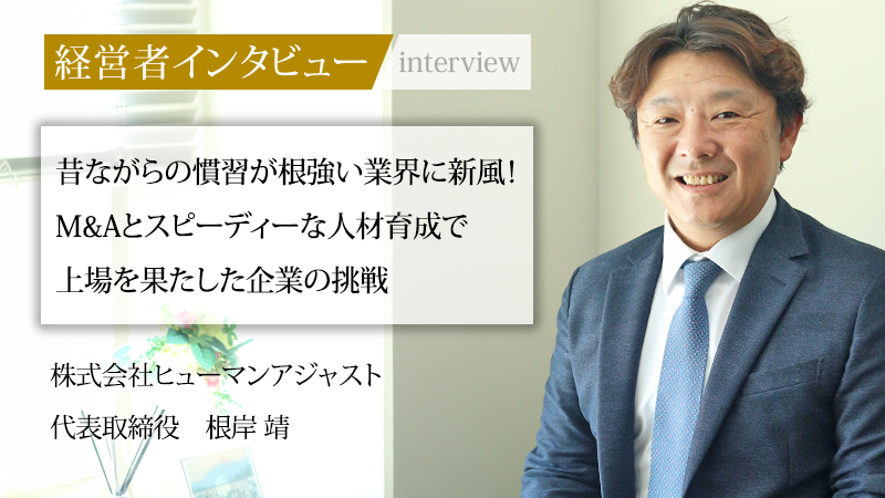 株式会社ヒューマンアジャストは、鍼灸接骨院を関東中心に59店舗展開し、M&A戦略とスピーディーな人材育成で急成長を遂げる企業である。昔ながらの業界慣習に挑み、透明性の高い経営と徹底した労務管理を実践。2024年には東京証券取引所プロマーケット市場などへの上場を果たした。代表取締役の根岸靖氏に、その経営哲学と業界の未来を切り拓く展望、上場に込めた想いについて、話をうかがった。
