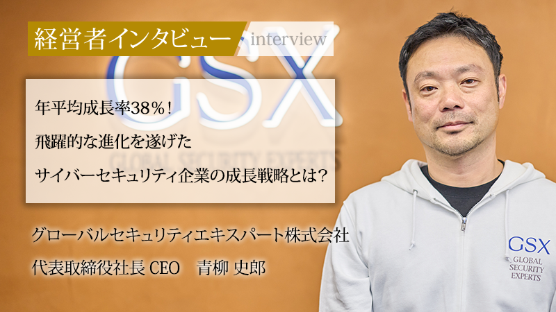 グローバルセキュリティエキスパート株式会社(GSX)は、サイバーセキュリティに特化したコンサルティング、教育、ソリューション提供を行う企業だ。2021年12月に東証マザーズ(現:東京証券取引所グロース市場)への上場を果たすと、過去6年間の年平均成長率は38%と急成長を遂げている。今回は、代表取締役社長 CEOを務める青柳史郎氏に、これまでの経歴や同社の成長の背景について話をうかがった。