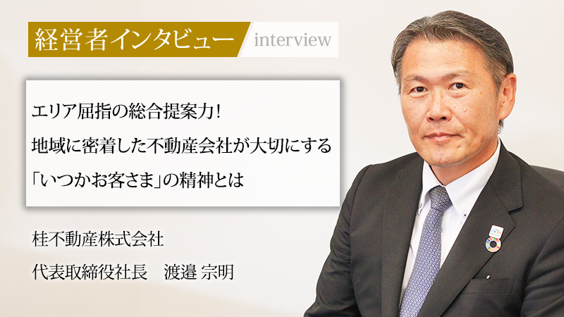 不動産売買仲介・賃貸仲介管理を手がける桂不動産株式会社は、不動産管理、住宅・店舗の建築・リフォーム、土地活用、保険、重機のレンタリースなどを手がけるグループ会社と共にエリア内屈指の総合提案力を誇っている。父の跡を継いで代表取締役社長に就任した渡邉宗明氏に、就任前に数々の支店を立ち上げた実績、大切にしている「いつかお客さま」の精神、そして今後注力すべきテーマについて話をうかがった。