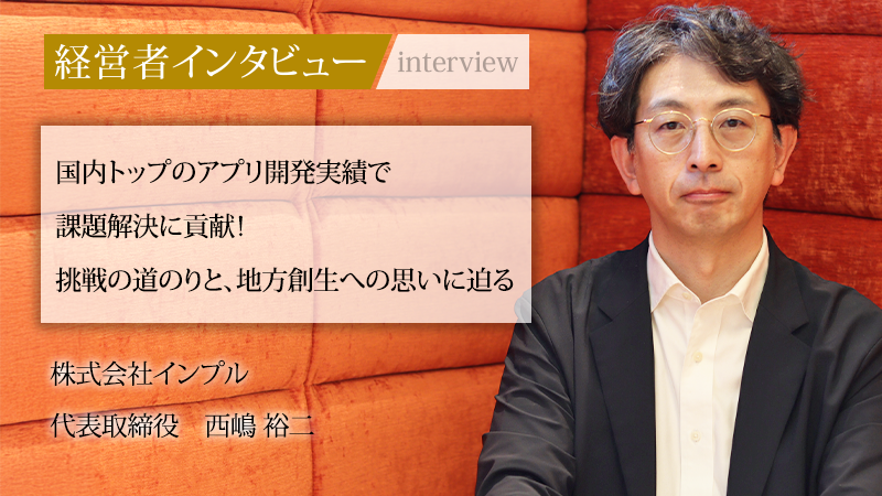 西嶋裕二/1974年生まれ。立命館大学理工学部環境システム専攻中退。株式会社ソフトフロントホールディングスなど4社のベンチャー企業にてプログラマーやSEとして、主に金融機関向けのモバイルアプリ開発に従事。2011年、37歳で株式会社インプルを設立し、代表取締役に就任。スマートフォンアプリ開発を強みとし、企業のDX推進や地方創生に貢献。「React Native」と「Flutter」開発においては国内有数の実績を持つ。