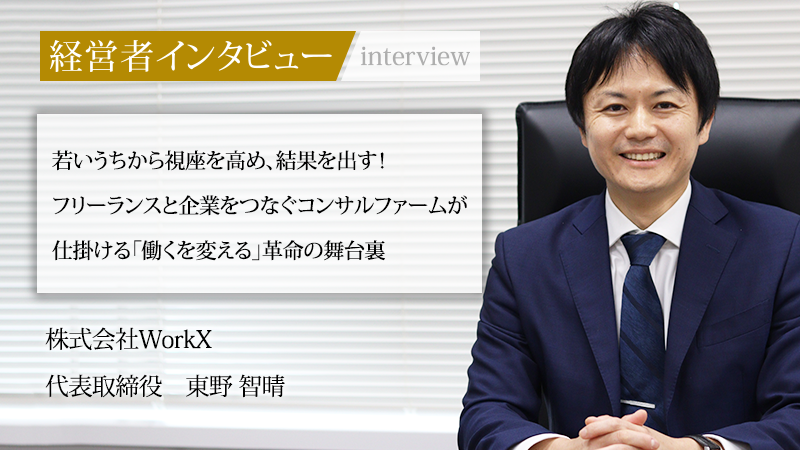働き方の多様化が進み、フリーランスという選択肢も広がっている現代。大手コンサルティングファームでの経験を経て「すべての人に自由な働き方を提供したい」という思いから株式会社WorkXを設立し、ハイクラスフリーランスと企業のマッチングプラットフォームを運営している、代表取締役の東野智晴氏。同社は、プロフェッショナル人材に新たな働き方を提案する事業を展開し、急成長を遂げている。今回は、事業を通じて目指す「働くを変える」という壮大なビジョン、そして人材育成に対する考えについて話をうかがった。