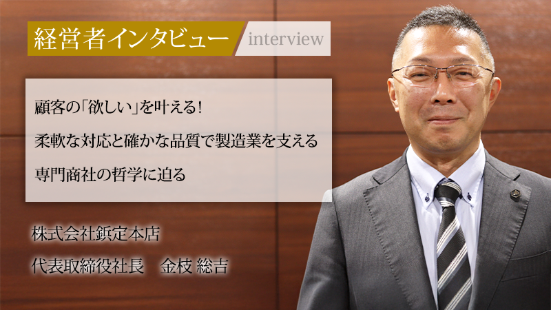製造業の縁の下の力持ちとして、締結部品の供給を担う株式会社鋲定本店。同社はネジを中心とした多様な部品の販売と特注品の開発を手がけ、小回りの利く対応力を武器にさまざまな顧客のニーズに応えている。「感謝と和合」の社是のもと、社員一人ひとりの個性を尊重し、永く続く企業を目指す金枝総吉社長に話をうかがった。
