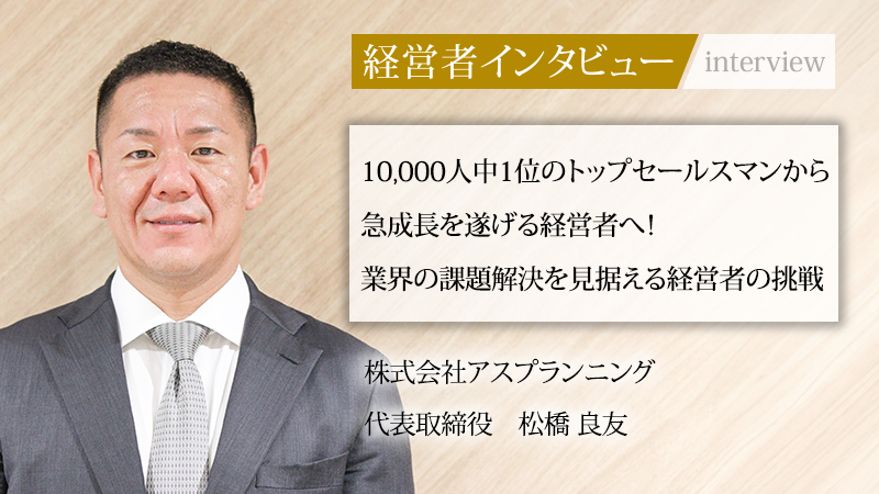 保険代理店事業を展開し、設立からわずか5年で急速な成長を遂げ、業界で注目を集めている株式会社アスプランニング。その成長を牽引する代表取締役の松橋良友氏は、弱冠20歳で10,000人の中でトップの営業成績を収めた実績がある人物だ。常識にとらわれず、独自の視点で事業を展開する松橋社長に、これまでの道のりや組織運営、そして業界の未来について話を聞いた。