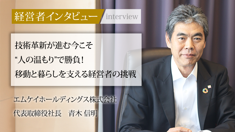 青木信明/1961年、京都府京都市生まれ。1982年、株式会社永井石油(現:エムケイ石油株式会社)に入社。1983年、エムケイ株式会社に入社。1999年、エムケイ株式会社の取締役、2003年に同社代表取締役に就任。2018年、エムケイホールディングス株式会社の代表取締役社長に就任。