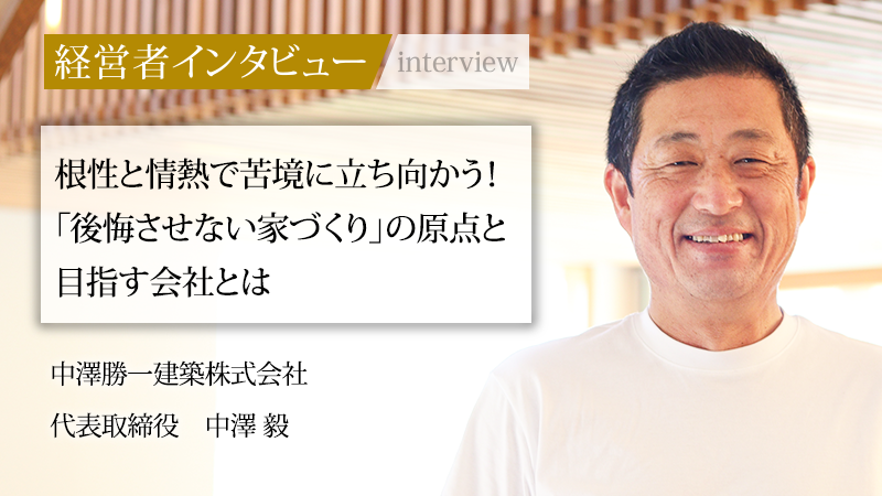 家業を継ぐことに明確なビジョンを持てず、ゼネコンでの9年間の修業を経て、父の会社へと戻った中澤氏。折からの不景気、そして主要取引先の倒産。利益の出ない激務の中、「職人を食べさせなければ」という一心で、たった一人で営業に奔走した。下請けからの脱却を決意し、幾多の失敗を乗り越えて自社ブランドを確立した中澤氏の歩みは、挑戦し続けることの価値を雄弁に物語っている。顧客に後悔させないという実直な「大工魂」と、社員の未来を守るという強い責任感。その両輪で、同社はこれからも確かな道を切り拓いていくだろう。