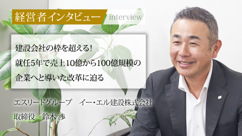 イー・エル建設株式会社は、エスリードグループの一員として建設事業を展開する企業だ。マンションやホテルなどの「新築事業」、大規模改修などを手掛ける「リニューアル事業」、そしてメーカーと共同でプロダクトを生み出す「商品開発」という3つの柱で、就任からわずか数年で売上100億円規模への急成長を遂げた。