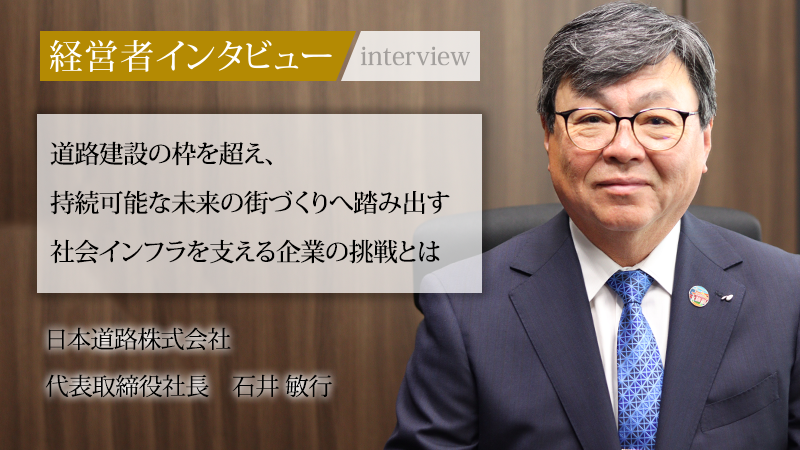 インフラの老朽化や人財不足など、多くの課題に直面する道路建設業界。公共事業から民間開発、海外展開に至るまで、多岐にわたる対応力と持続可能な成長戦略が求められている。そのような状況下で、日本道路株式会社は「道からはじまる街づくり」というコーポレートスローガンを掲げ、長年にわたり培ってきた技術力と強固な組織力を武器に、新たな挑戦を続けている。同社の代表取締役社長である石井敏行氏に、これまでの歩みと現在の経営スタンス、そして創立100年を見据えた今後の展望について話を聞いた。