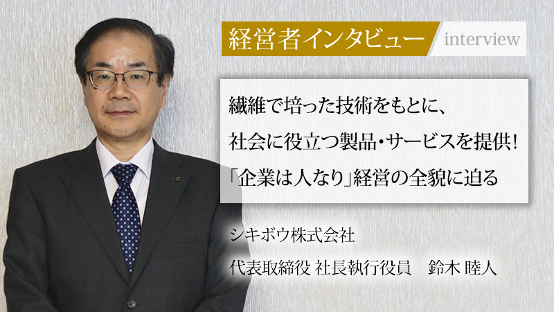 鈴木睦人/1965年生まれ。岐阜県出身。1988年に信州大学繊維学部を卒業。同年4月に敷島紡績株式会社(現シキボウ株式会社)に入社し、繊維部門の国内外生産・開発に従事。国内外グループ会社の社長を歴任し、2019年執行役員に就任。2021年機能材料部門複合材料部長、2024年コーポレート部門副部門長を経て、2025年6月代表取締役社長執行役員に就任。祖業である繊維の技術に磨きをかけつつ新しい価値創造へチャレンジを続けている。
