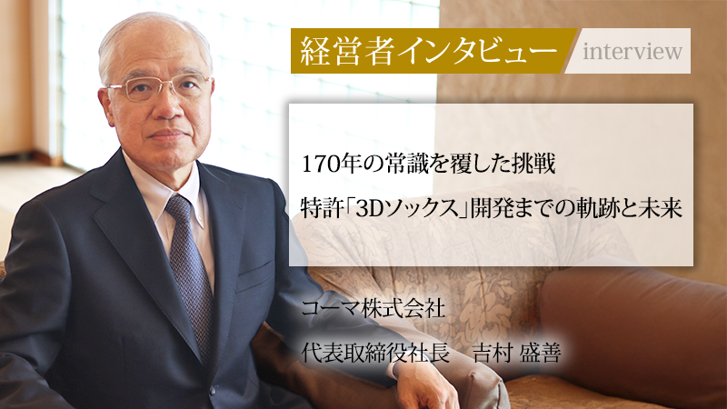 1922年の創業以来、一世紀以上にわたり日本の靴下産業を支えてきたコーマ株式会社。染色から仕上げまでを一貫して国内で行う生産体制を強みとし、OEM事業を中心に展開している。業界の常識を覆す立体構造の「3Dソックス」で特許を取得するなど、伝統を守りながら革新的な挑戦を続ける同社。父から事業を受け継ぎ、数々の苦難を乗り越えてきた代表取締役社長の吉村盛善氏に、その歩みとものづくりへの哲学、そして未来への展望をうかがった。