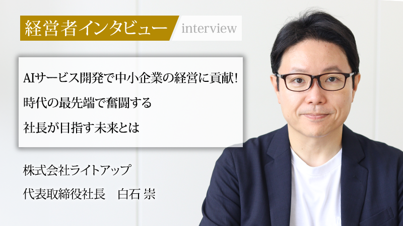 「全国、全ての中小企業を黒字にする」をビジョンに掲げ、AI技術で経営支援を行う株式会社ライトアップ。リーマンショックなどの社会的な危機さえも好機に変え、成長を続けてきた。そんな同社を率いるのは、株式会社サイバーエージェントのコンテンツ部門責任者から、周囲の後押しを受けて独立した代表取締役社長、白石崇氏だ。「人に依存しない経営モデル」をAIで確立した同氏に、その軌跡と描く未来について話を聞いた。