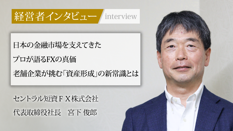 100年以上の歴史を持つセントラル短資グループを母体とする、セントラル短資FX株式会社。FX(外国為替証拠金取引)には「危ない」といった世間のイメージが先行しがちだ。しかし同社は、短期的な利益追求ではなく、長期的な資産形成を支えるという独自のスタンスを貫いている。代表取締役社長の宮下俊郎氏は、日本銀行でキャリアを積み、日本経済の大きなうねりを体感してきた。その経験から得た揺るぎない経営哲学を持つ。FXのネガティブなイメージを刷新し、特に若い世代にその真の価値を伝えたいと語る同氏の情熱と、老舗企業を率いるリーダーの挑戦に迫る。