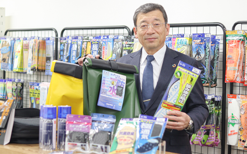 看板商品としては、靴のインソールや足腰につけるサポーター、防水バッグなどがあり、特にシューケア関連の商品は強いです。