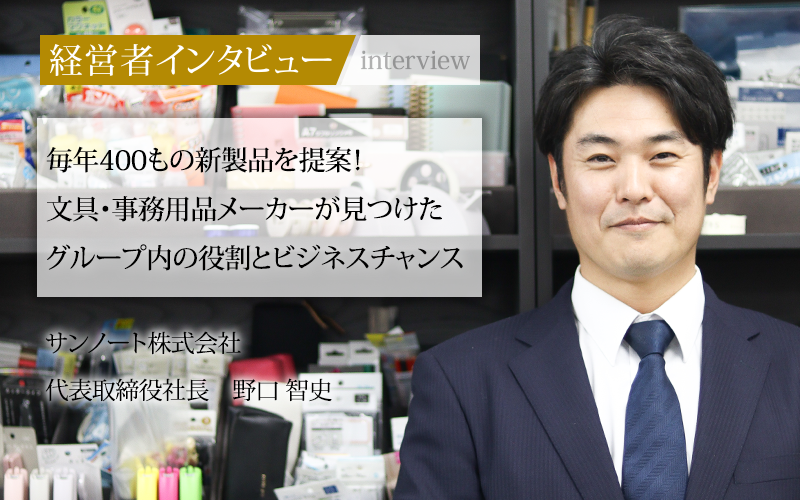 1984年に設立されたサンノート株式会社。ノートなどの紙製品をはじめ、文具や事務用品の企画・製造・販売を一貫して手がけるメーカーだ。企業の特徴ともいえる主要な販売ルートは、大手100円ショップを展開する複数の小売企業。代表取締役社長の野口智史氏に、入社後の取り組みや人材の育成方針、今後の展望をうかがった。