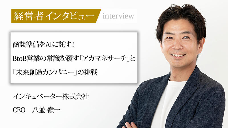 セールスとHRの領域で「10年後の未来を創造する」をテーマに、AIを活用した自社プロダクト開発を手掛けるインキュベーター株式会社。同社は顧客の現場に寄り添うことで得た知見を活かし、AIを活用しBtoB営業の商談準備を効率化・高度化する新サービス「アカマネサーチ(※特許申請中)」を強みとしている。上場企業の役員という安定したキャリアを捨て、再び起業家として挑戦の道を選んだ代表取締役、八並嶺一氏。本記事では、同社が新たにリリースしたBtoB営業の商談前分析AI「アカマネサーチ」の全貌と、事業の根底に流れる八並氏の揺るぎない経営哲学、そして仲間と共に描く未来像に迫る。