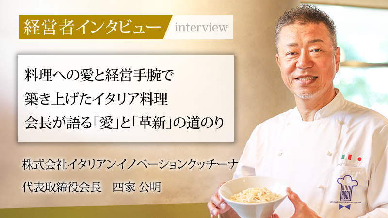 食材が料理人の愛と工夫次第で姿を変える料理への尽きない情熱と、お客様の笑顔を原動力にするために全店オープンキッチンを採用するなど、「料理人」としての顔。そして、19店舗の組織を率い、新事業を次々と生み出す「経営者」としての顔。この二面性こそ、株式会社イタリアンイノベーションクッチーナの創業者であり、代表取締役会長である四家公明氏が持つ最大の魅力である。