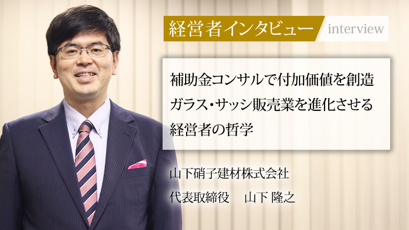 山下隆之/1976年大阪市天王寺区生まれ。大阪府立高津高等学校、神戸大学経済学部卒業。2000年東京海上火災保険株式会社入社後、8年の勤務を経て、2007年山下硝子建材株式会社へ入社。2012年に同社代表取締役に就任。建築資材の販売と脱炭素省エネ補助金の活用支援という二刀流で活動している。