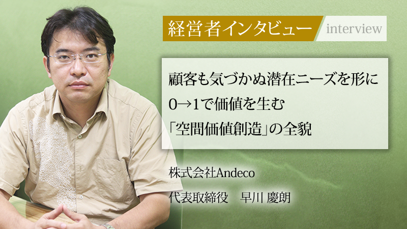 「空間価値の創造と向上」をミッションに掲げ、スマートビルディングやPFI事業(※1)、カーボンニュートラルといった多角的なアプローチで未来の社会基盤づくりに貢献する株式会社Andeco。言語化できていない顧客の潜在的な要望を汲み取り、ゼロから新たな価値を企画・実装するコンサルティングを強みとする。大手総合建設会社をパートナーに、最先端のビル・街づくりを推進する同社は、建築業界の変革をリードする存在だ。大手通信会社での経験を経て同社を創業した代表取締役、早川慶朗氏に、その挑戦の軌跡と事業の核心、そして未来への思いを聞いた。