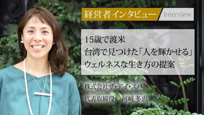 心身が本来持つ輝きを取り戻し、より良く生きるための「ウェルネス」という概念。その思想に基づき、上質な空間でホリスティックなスパサービスを展開するのが、株式会社ザ・デイ・スパだ。同社の提供するサービスは、単なる美容やトリートメントにとどまらず、人の根源的な活力を呼び覚ますことを目指している。15歳での渡米や台湾での運命的な出会いを経て、同社を創業。「人間が人間らしく生きることに貢献したい」との強い使命感を抱く代表取締役の河﨑多恵氏。今回同氏に、その情熱の源泉と事業の未来像を聞いた。