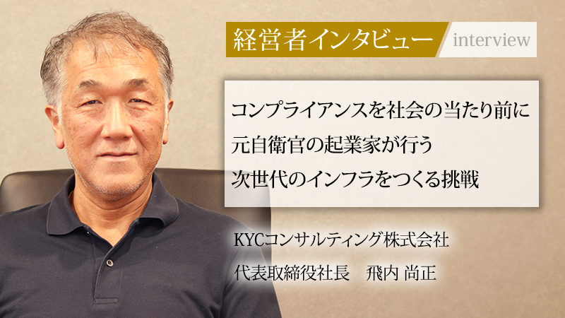 KYCコンサルティング株式会社は、テクノロジーで企業のマネーロンダリング対策やコンプライアンス遵守を支援する企業だ。日本では、金融機関以外の事業者におけるKYC(本人確認)の実施や監査に十分な強制力がなく、また個人情報保護法との整合性の問題もあって、効果的なリスク管理が難しい現状があります。こうした課題を解決し、「世界水準のKYC社会インフラを構築する」ことをビジョンに掲げる。同社を率いるのは、代表取締役社長の飛内尚正氏。海上自衛隊、リスクマネジメントの専門家を経て、52歳で起業した経歴を持つ。その決断の裏にあった強い思い、そして同社独自の強みと社会インフラを目指す壮大なビジョンに迫る。