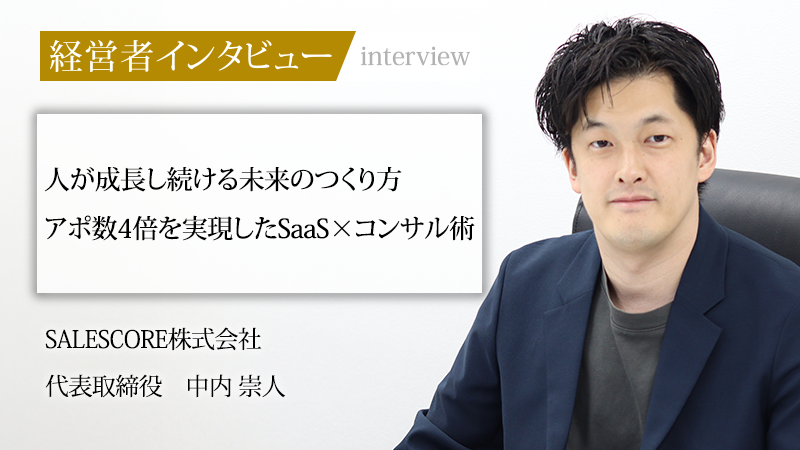 SaaSとコンサルティングを両輪に、営業組織に変革をもたらすSALESCORE株式会社。同社は独自の「文化のインストール」という手法で、組織が持つ「当たり前の水準」を引き上げることで、組織の持続的な成長を実現する。大学時代に出会った起業家たちの逆境を楽しむ生き方に憧れ、営業という職能そのものを進化させることを志した代表取締役の中内崇人氏。その情熱の源泉と事業の核心、そして見据える未来について話を聞いた。
