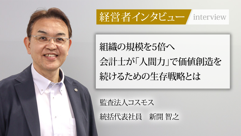 新開智之/1968年、愛知県一宮市生まれ。1992年に岐阜大学教育学部を卒業後、公認会計士の道を志す。1994年、監査法人コスモスに入所。2007年に代表社員、2019年に統括代表社員に就任。中小企業支援、特に東京プロマーケットへの上場支援を強みとし、法人を急成長に導く。現在は太平洋工業株式会社、サン電子株式会社にて社外取締役監査等委員も務める。