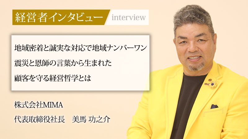 美馬功之介/1968年大阪府生まれ。学生時代、リュックでの1人旅でアジア・アフリカ・ヨーロッパ・アメリカなど世界を放浪。大学卒業後は大手ハウスメーカーに就職し、不動産事業に従事。2003年に株式会社MIMAの代表取締役社長に就任。事業を下請けの設備工事からリフォームの元請けへと転換させた。地元である大阪府八尾市においては、住宅リフォーム売上で長年にわたりトップクラスの実績を誇る。経済産業省「日本のはばたく中小企業300社」「河内を代表する企業100選」に選出。八尾市中小企業地域振興功績者顕彰も受賞。