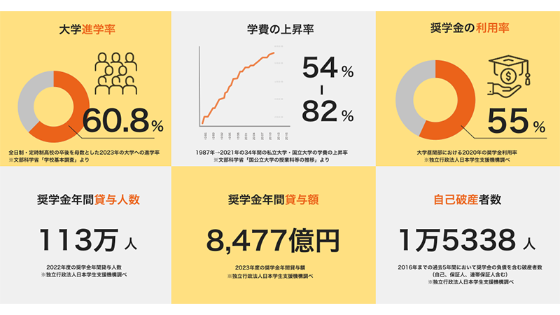 現在、最も力を入れているのが「奨学金バンク」です。35歳になっても奨学金を返還している人がいると聞き、衝撃を受けたことがきっかけでした。日本では大学生の2人に1人が約300万円の奨学金を借り、卒業後約15年かけて返還しています。この返還負担の大きさから、スキルアップのための自己投資や起業へのチャレンジ、結婚や出産といったライフステージの変化にも積極的になれないケースも見受けられ、実際に一部の自己破産者を生んでいる実態もあります。この現状に危機感を抱き、返還するタイミングでの支援に取り組むべきだと感じました。