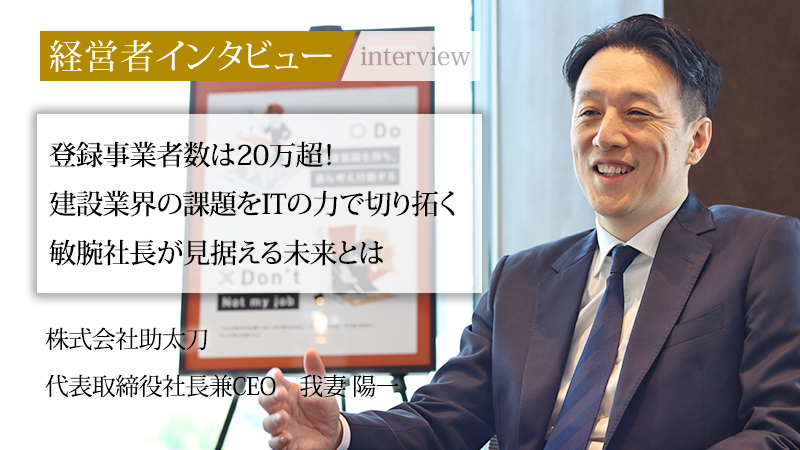 慢性的な人材不足に悩む建設業界で、職人と工事会社をつなぐという画期的なマッチングアプリ「助太刀」を開発した株式会社助太刀。現在のアプリ登録事業者数は22万事業者を突破し、圧倒的なシェアを誇っている。電気工事会社を起業後、MBAを取得し、スタートアップ領域への挑戦を図った代表取締役社長兼CEO・我妻陽一氏に、業界が抱える課題と、自社サービスの魅力、今後の事業展開について話をうかがった。